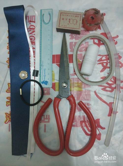 准备好所有材料(如图),这些材料基本都可以找到,QQ线可以用缝纫机上的细线代替哦,缎带可以用一些礼品包装上的绸带做,选一些硬度好点的材料,也可以在不穿的衣服上找找,应该会有的。