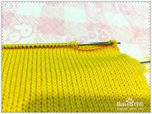 完成贴边部分的弹力针以后,直接改成全下针,与原有针数一样,继续织裤管。一般贴边部分5-6CM宽度,太窄了会卷边,太宽了影响裤管长度。