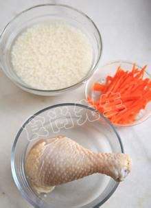 将糯米洗净,浸泡约30分钟;鸡腿洗净,沥干;胡萝卜去皮洗净,切丝。