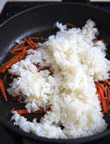 锅中加入胡萝卜丝及调味料,煮滚后熄火,加入红葱酥及糯米饭拌匀即为油饭。