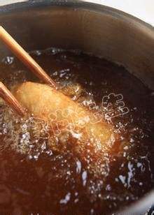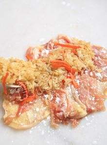 将腌制好的鸡腿肉打开,撒上适量太白粉,铺上炒好的油饭,再捲聚成春卷形的筒状。
