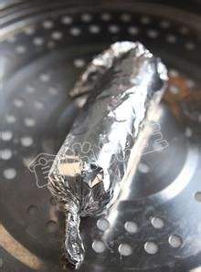 取一张铝箔纸,放入鸡腿,两头卷紧,捏成糖果状,再放入蒸笼蒸约20分钟。