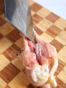 将鸡腿用刀对切,去骨、断筋,撒入适量盐及胡椒粉腌制20分钟。