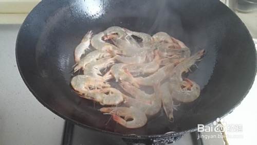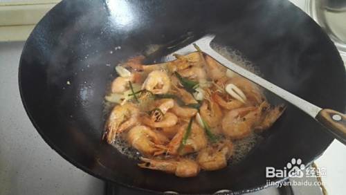 煎至虾变色,放入葱姜蒜炒出香味