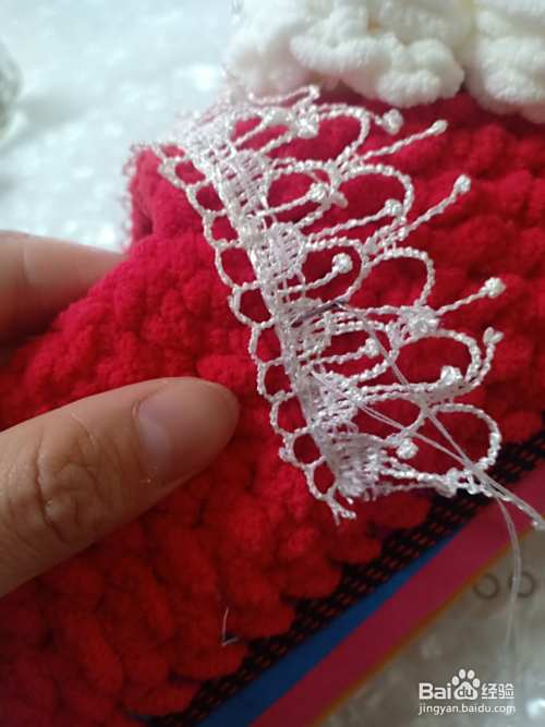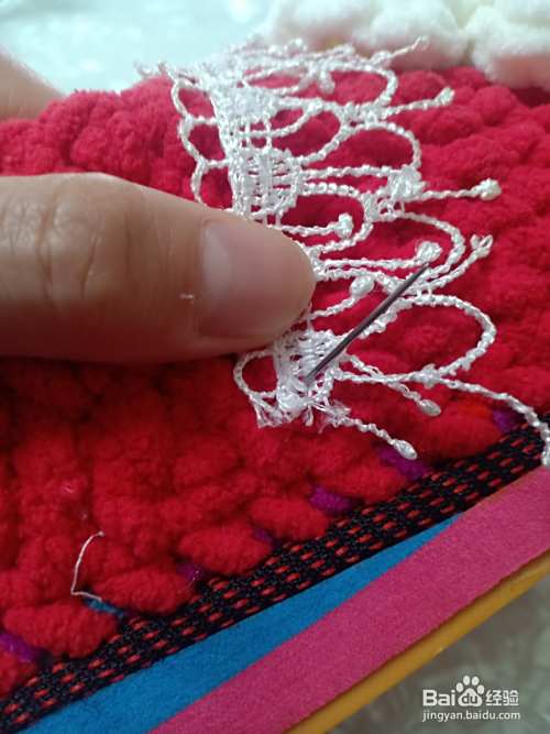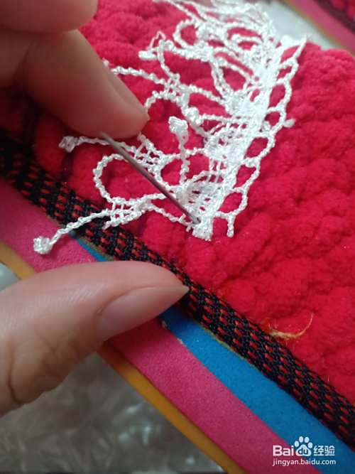 确认好位置后,取出针线,在蕾丝边角处,缝合几针固定。