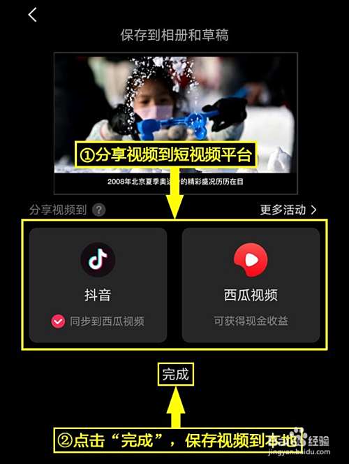 保存分享。分享视频到短视频平台;点击“完成”,保存视频到本地。