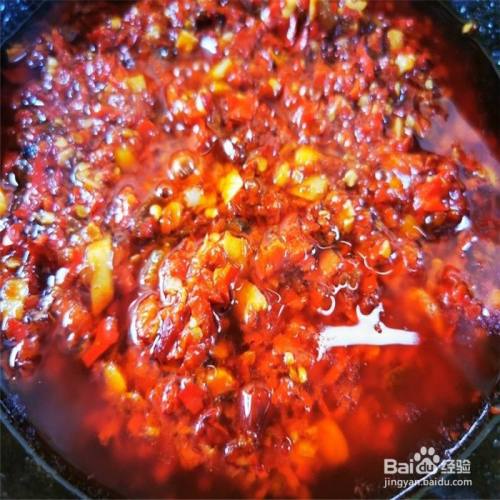 锅中倒油,下入切好的辣椒,加入一勺豆瓣酱,熬制20分钟。