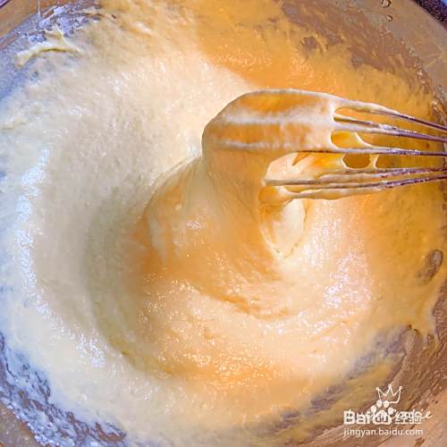 把面粉倒入鸡蛋牛奶液中,往一个方向搅拌均匀,搅拌至图片中那样的粘稠的样子就OK啦!(如果觉得太稀了就再加点面粉~)盖上保鲜膜发酵~