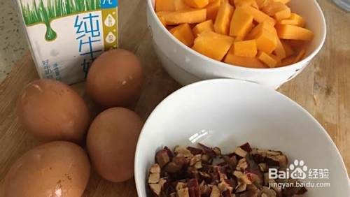 南瓜去皮去瓤切块或切片最好切成小丁,总之尽量碎小,待会儿要放入料理机打浆,南瓜硬不是很好打颗粒小会好很多。很多网上介绍都先把南瓜煮熟,我个人认为直接生鲜打浆更利于保留食材营养,口感也更香甜。和田狗头枣去核切丁备用。鸡蛋打散。