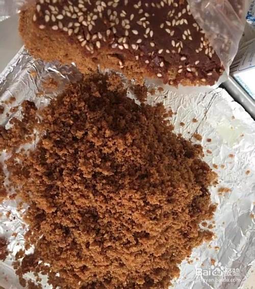 烤盘锡箔纸铺底,剩余枣糕碾碎铺底。