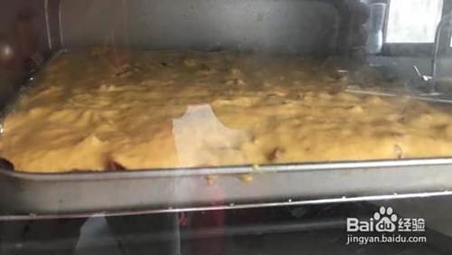烤制中,可见开始起发。掌握好量不要没过烤盘,否则烤制起发会溢出烤盘。