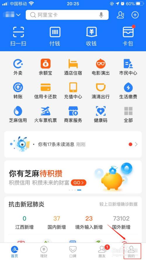第一步手机上打开实名认证的支付宝首页,进入到首页后点击右下角的【我的】按钮,如图所示: