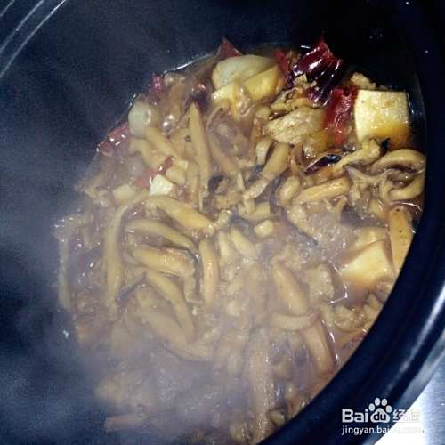 加开水浸没食材,放点干辣椒段,淋上生抽,加盐,蚝油,鸡精。盖上锅盖,中火焖五至八分钟。