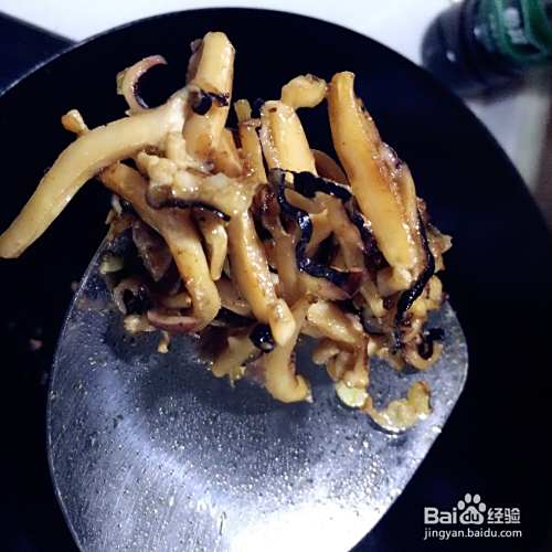 墨鱼泡发后切丝,少油炒至变色。