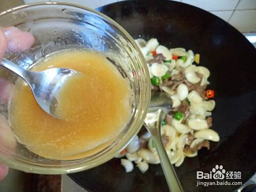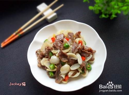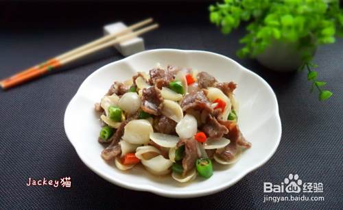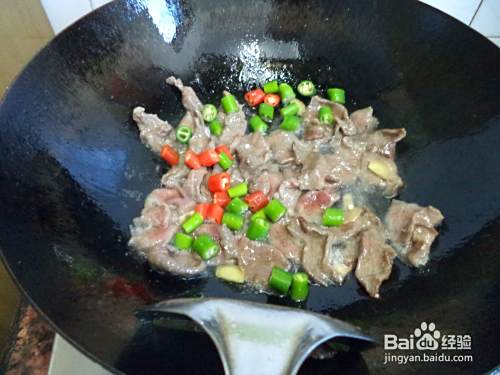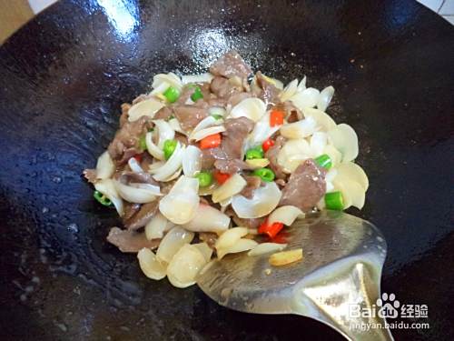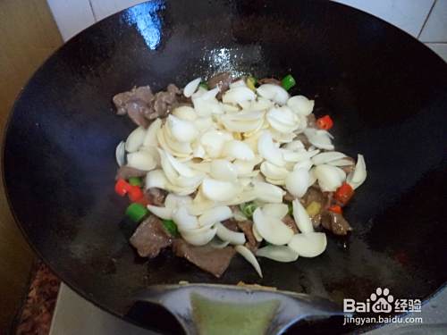 牛肉切片,青红椒切小段,姜切指甲片,百合清洗干净。