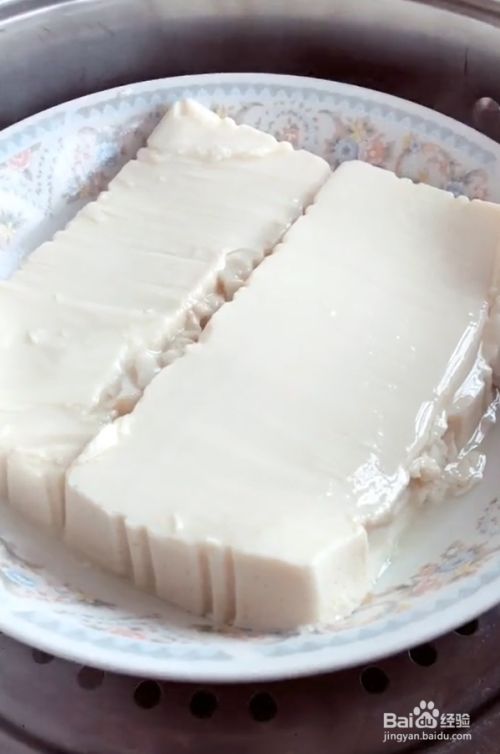 内脂豆腐中间片一刀,上锅蒸8-10分钟。
