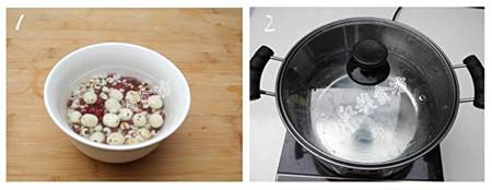 1. 莲子、红豆和薏米用水冲洗洁净,浸泡半小时(浸泡浪费前面煮粥的时间)。