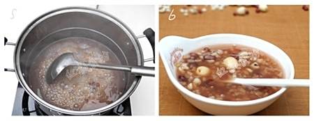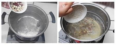 4. 大火煮半小时,放入洗净的薏米(莲子、红豆和薏米要难煮一些,为了能同步熟,后放薏米)。