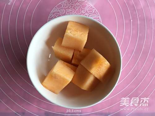 6年糕降温的时间我们准备哈蜜瓜,把哈蜜瓜切成3厘米的小方块。