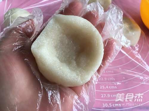 9取出一份用手按成一个小碗形状,这样比较好放哈蜜瓜。