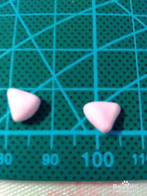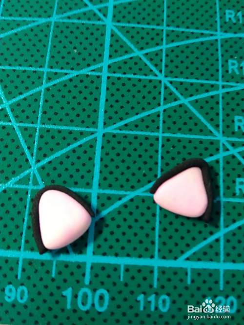 粉色粘土捏两个三角形的片,然后用黑色粘土搓成条后绕在外圈,做成喵喵的耳朵