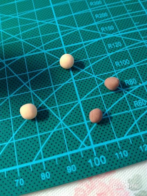 取跟身体一样颜色的粘土,搓两个小球做成喵喵的手,棕色粘土搓两个小球做成喵喵的脚,然后将耳朵、手、脚粘在身体相应的部位