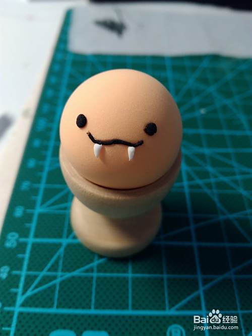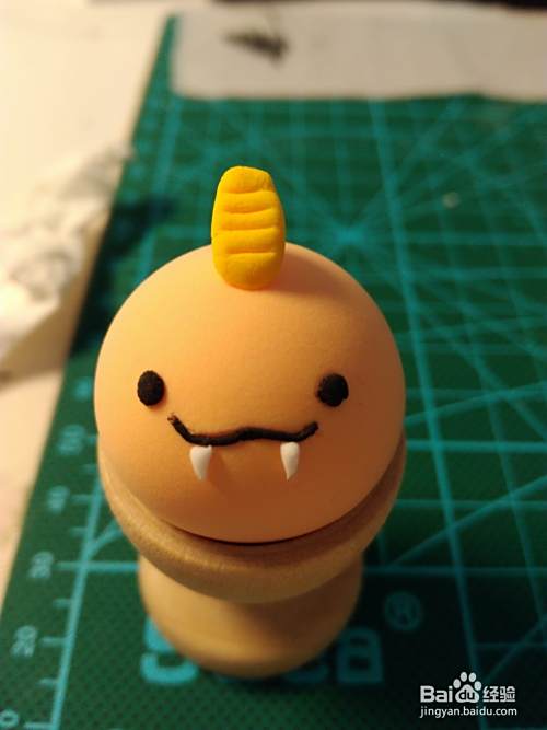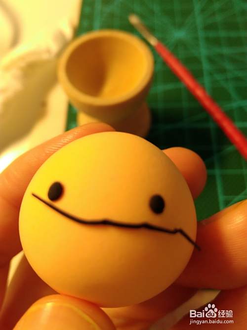 黑色粘土做出圆圆的眼睛和嘴,嘴部的制作是现将黑色粘土搓成细条,然后放到嘴部位置调整裁剪