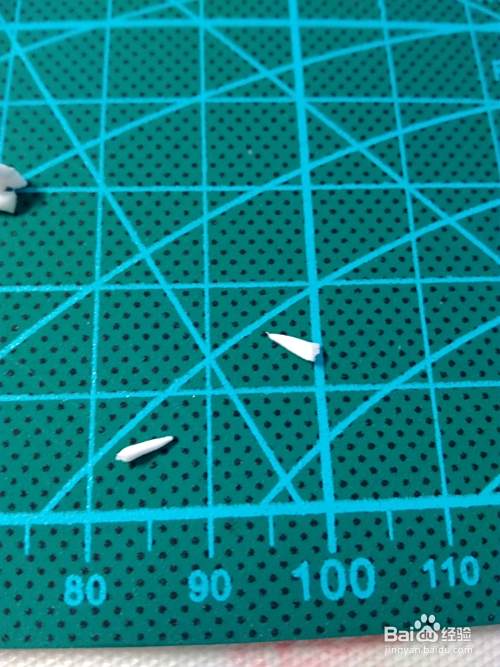 白色粘土捏成两个小小的圆锥,做成喵喵的两颗尖牙