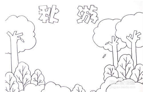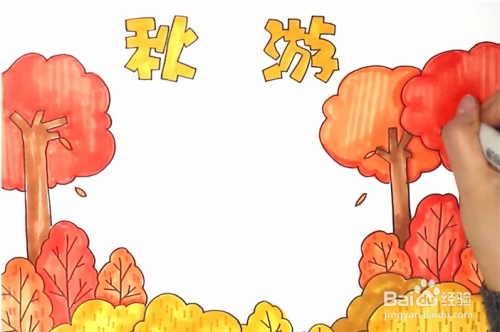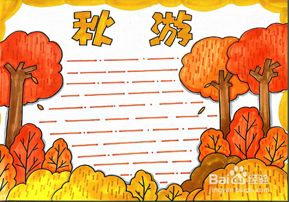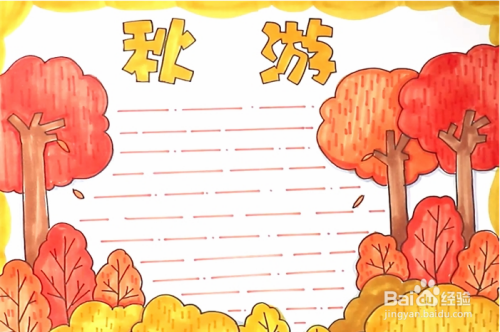最后用红色点缀大树,给手抄报画上黄色边框,在空白的位置画上横线,秋游小报就完成了。