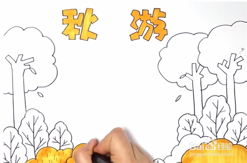 首先写上报头,在底部两侧画几棵大树,然后就可以开始上色了,用黄色涂报头,将灌木丛也涂上黄色,用橙色和红橙色将树木涂上颜色,最后给小报边缘涂黄色,在空白的位置画上横线,秋游小报就完成了。
