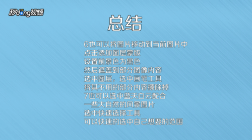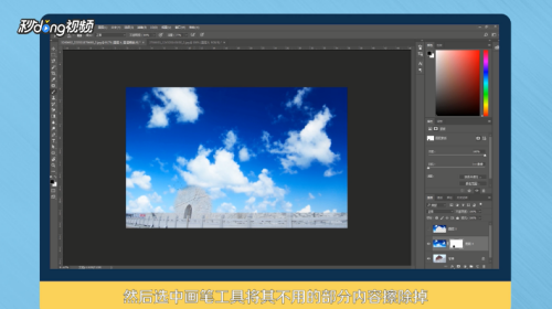 5将图片移动到当前图片中,点击添加图层蒙版,设置前景色为黑色,遮盖到部分图像内容,选中图层,选中画笔工具,将其不用的部分内容擦除。