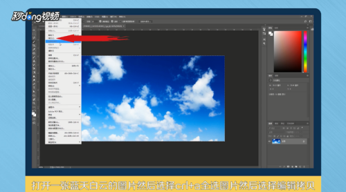 3打开一张蓝天白云的图片,按下“ctrl+A”全选图片,选择“编辑”中的“拷贝”,全选图片表示图片所有内容都会被贴入到另外一张照片中。