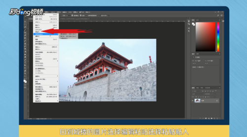 4回到城楼图片,选择“编辑”中的“粘贴”,选择“粘贴贴入”,选择性粘贴是粘贴图片不变,粘贴贴入是对所选区域进行粘贴,外部粘贴是相当于反选的作用。