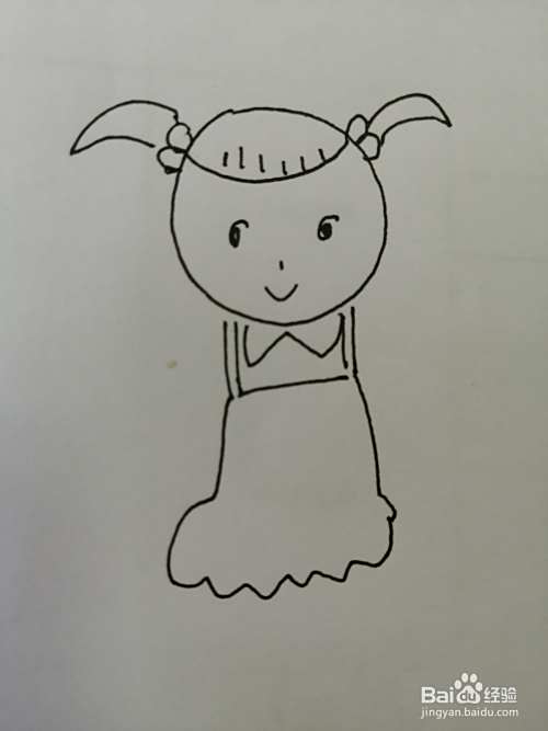 第四步,接着继续画出可爱的小女孩的漂亮的小衣服,注意小女孩衣服上蝴蝶结的画法。