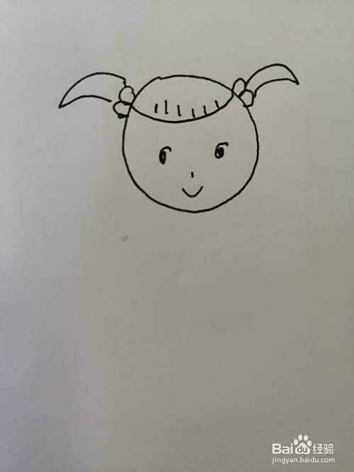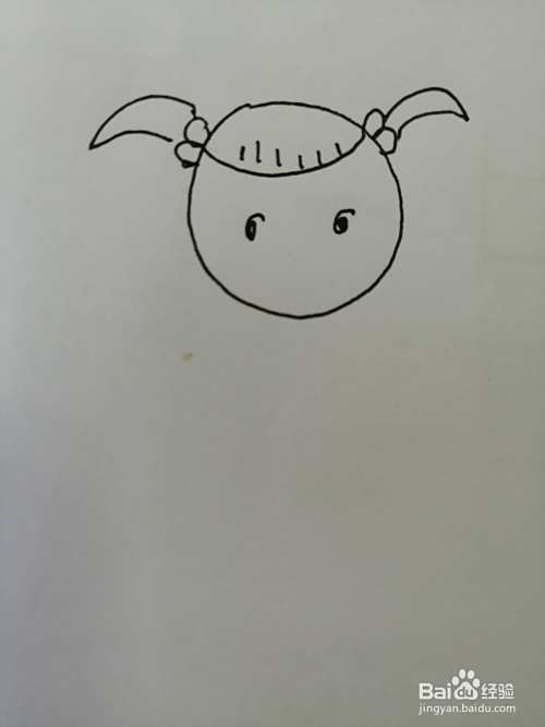 第三步,然后继续画出活泼的小女孩的两只大眼睛和可爱的小嘴巴,画法也比较简单。