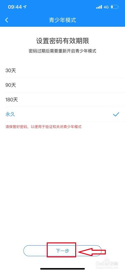 如图,在此页面需要设置青少年模式有效的期限。设置好时间后点击下一步。