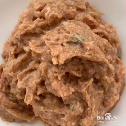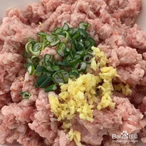 再准备适量肉馅,加上葱姜和适量味精、鸡精。