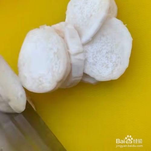 准备两根杏鲍菇,洗干净切成夹刀片,如图备用。