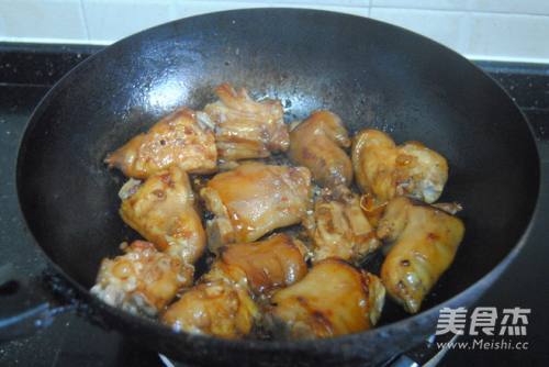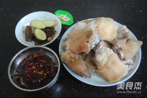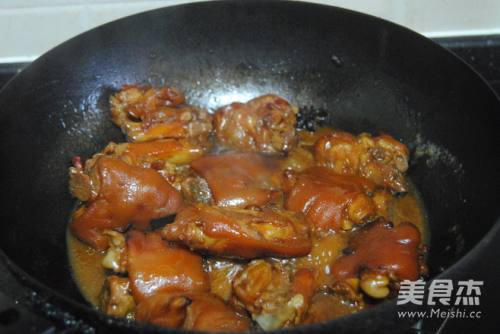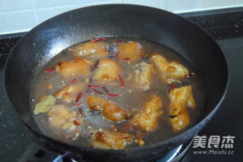 7加入没过猪手的水,放入辣椒干,盖上锅盖大火煮开后,小火慢炖35分钟