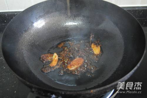 6加入料酒胡椒粉,酱油翻炒2分钟后,倒入所有香料翻炒至出香气,倒入浓汤宝翻匀