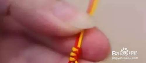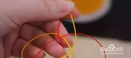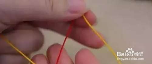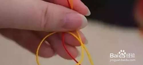 把黄色绳压到红色绳上,再从红色绳后面绕出来,留一个圈。