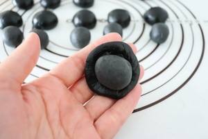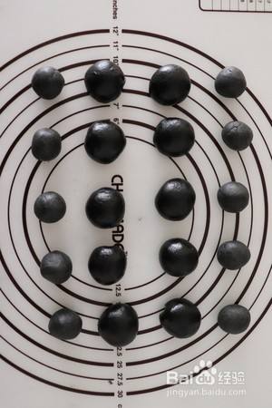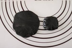准备油酥:低粉、猪油、墨鱼汁一起搓匀,油皮和油酥分别分成10份。 油酥: 低筋面粉:56g、猪油:28g、墨鱼汁:4g