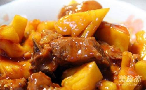 6排骨裹好番茄汁后,加入适量热水,焖煮五分钟后,加入切好的菠萝,一起焖煮十分钟后,勾芡收汁
