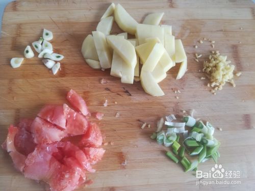 把土豆去皮洗净切成条,西红柿切成块,葱切葱花,姜切末,蒜切成片。