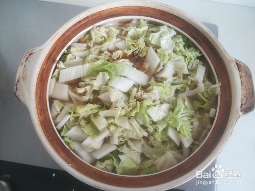接着把白菜块入锅继续炖煮到白菜熟透。