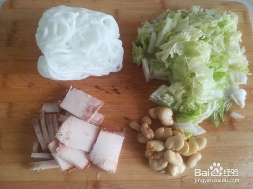 再把烧猪肉切成片,白菜切成块,大豆泡软去皮及粉条备用。