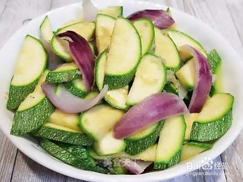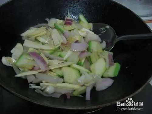 锅内倒入少许油,放入葱花炒香,放入茭瓜片翻炒2分钟后放入洋葱翻炒2分钟。