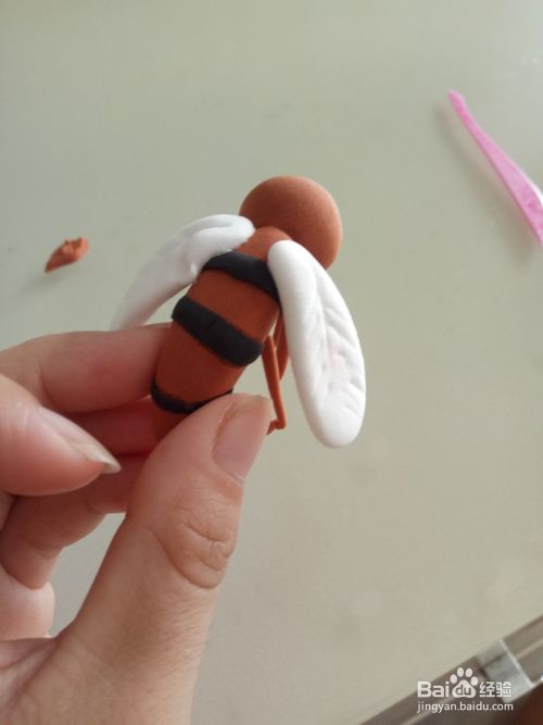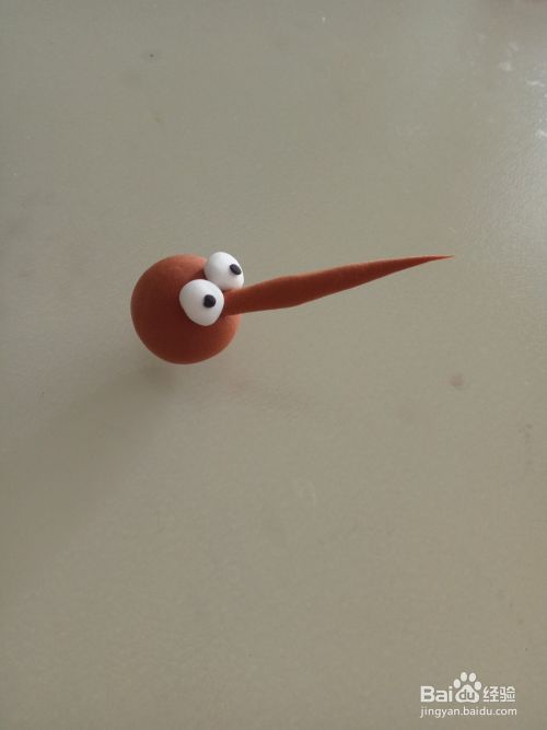 再取少许棕色橡皮泥搓一头尖尖的细长条当做蚊子得罪嘴巴,用白色和黑色做出蚊子的眼睛。