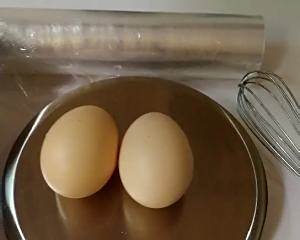 准备两个鸡蛋,两个碗,一个打蛋器,一碗饮水机里烧好的热水,一个面粉筛,忘了上镜