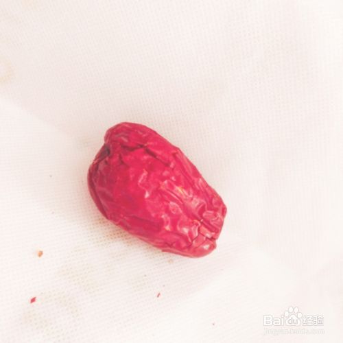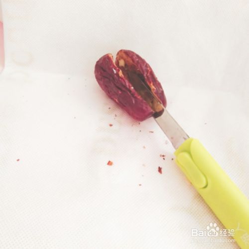 第四步:用水果刀将红枣切开,去掉红枣仔,如下图所示。